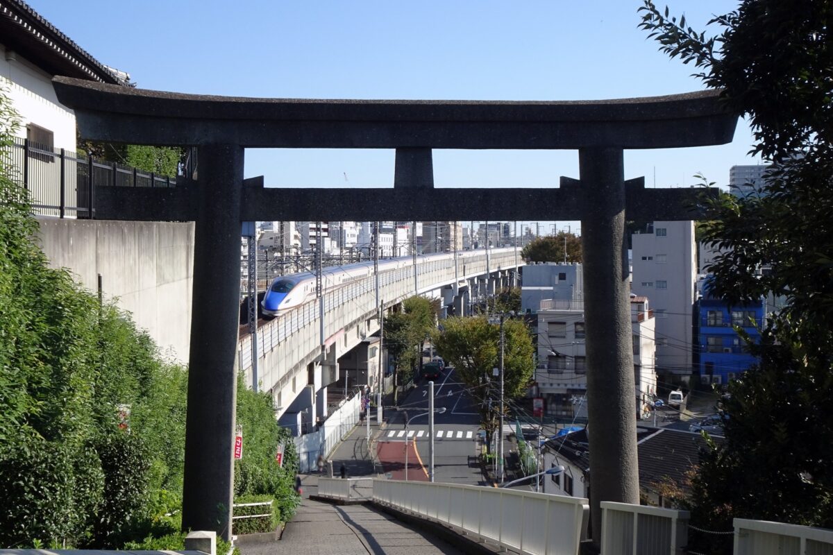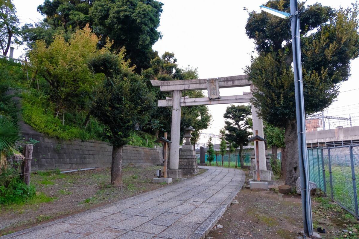 神社の敷地と一体化し鉄道跡。かつては神社の横をが走り、現在の新幹線のガードをくぐり台地の上へ登っていったのです。