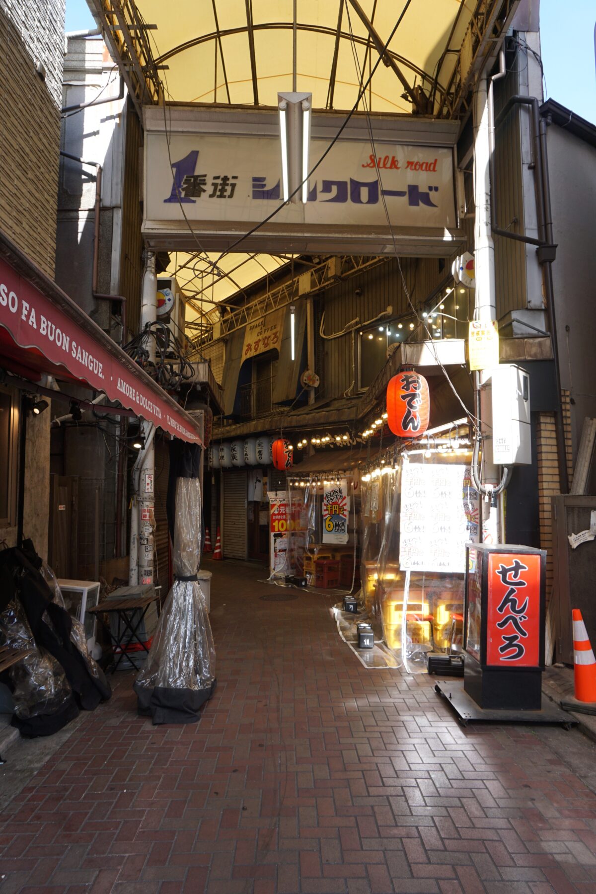 ブラタモリは、赤羽駅東口の昼呑みの文字がいくつか見える横丁へ。1番街シルクロードに入ると「せんべろ」の看板。大衆酒場きぶんや 本店の前にありますが、書かれている電話番号は別の店で横丁共有の看板かも知れません。