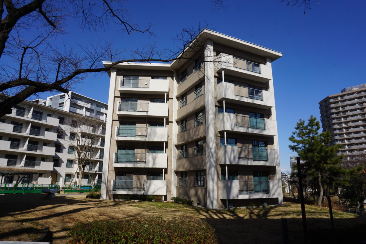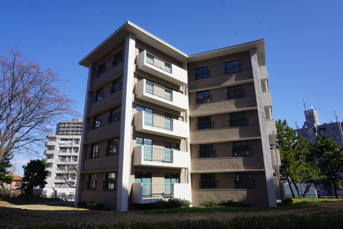 戦後住宅不足を背景に、陸軍被服本廠跡地に建設された東京23区初の大規模団地内の特別な棟で、当時の新婚世帯に人気の風呂付きモダン住宅でした。建て替えが進む中、42〜44号棟の3棟と41号棟が国の登録有形文化財(2019年指定)に保存されています。
