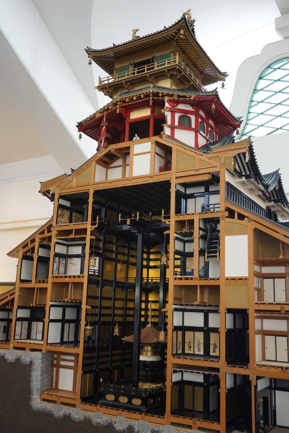 地下1階、地上6階の壮大な城郭。吹き抜けに収まる宝塔が印象的ですが、吹き抜けの有無など諸説あります。安土駅前の安土城郭資料館で見学できます。