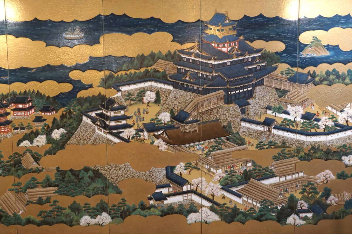 ローマへ贈られた屏風絵に描かれた安土城。7層(地下1階、地上6階)から成る日本初の高層建築で、高さは46mに及びました。