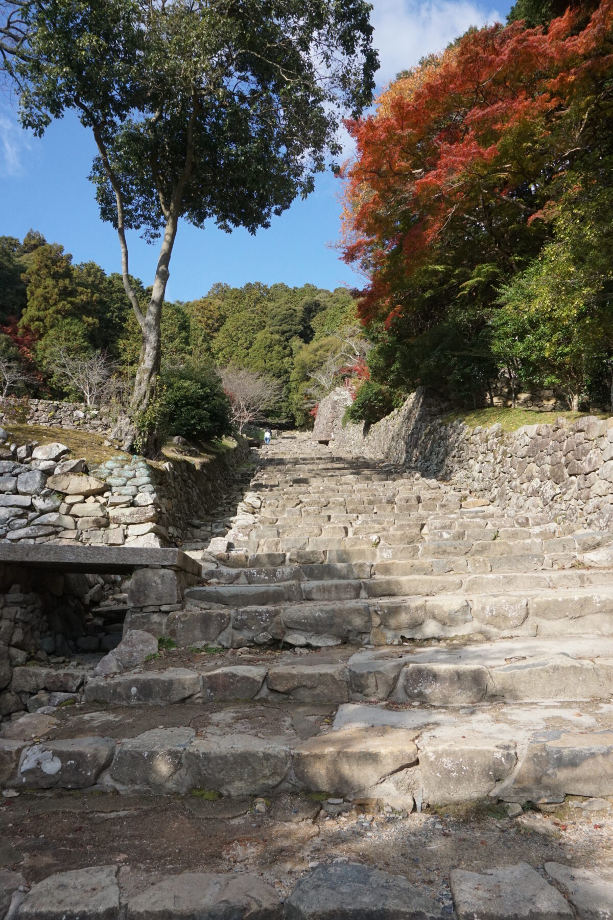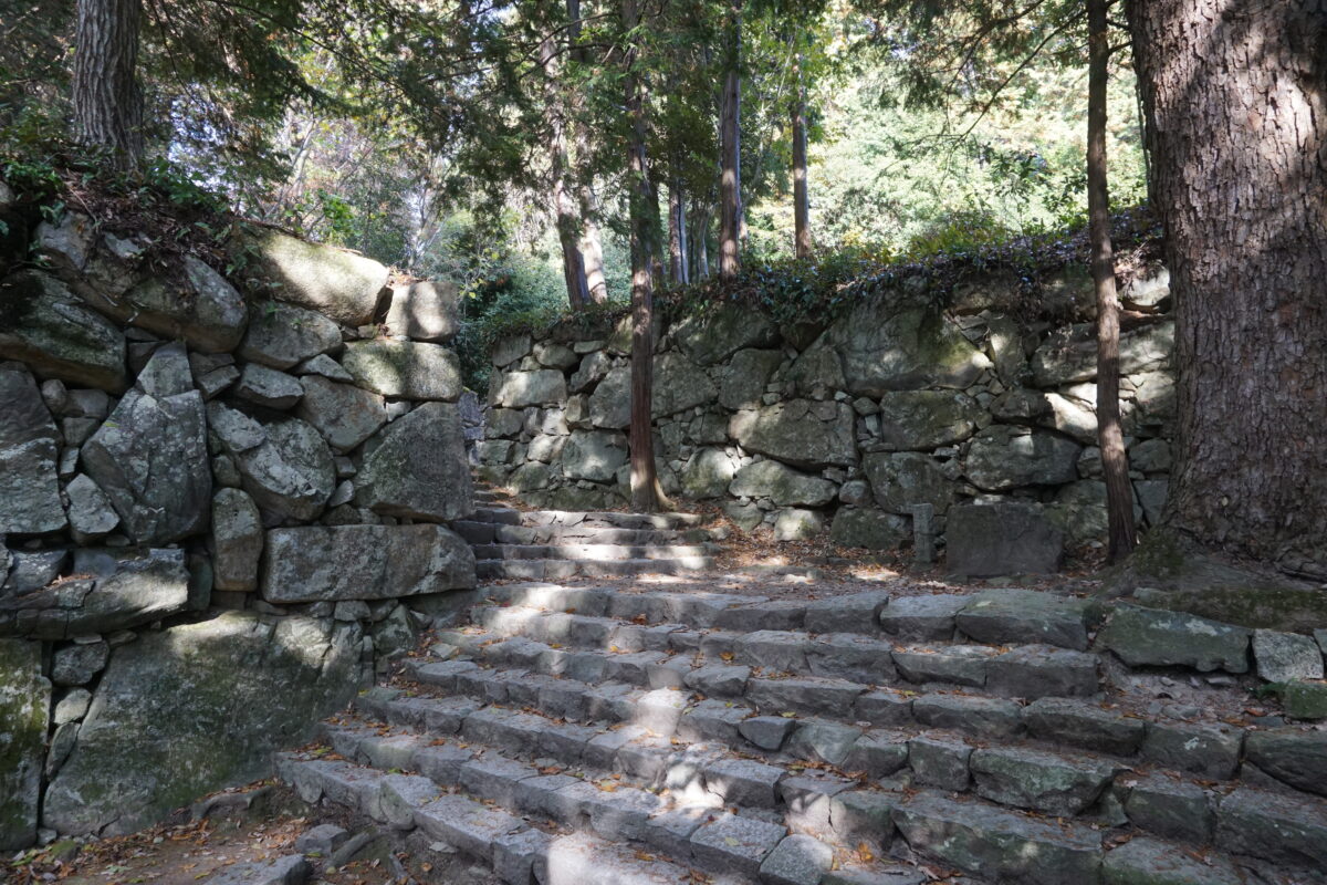 大手道を上がると黒金門跡。ジグザグ型の守りが見られます。一般に枡形虎口(ますがたこぐち)と呼びます。