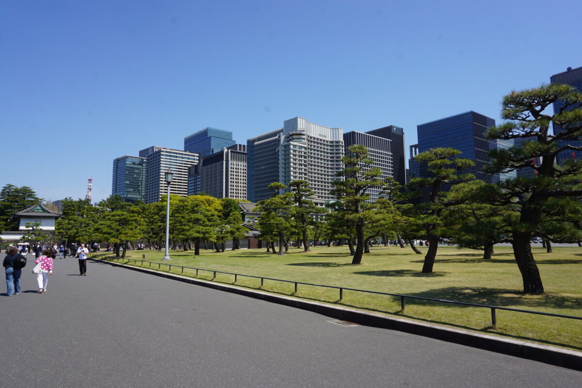 皇居は「の」の字をモチーフに考えると分かりやすく、東側が江戸城の本丸、二の丸ちなります(現在の東御苑)。その南はもとは武家屋敷地でしたが、明治維新後に皇居を仰ぎ見る広場として外苑として整備されました(少し上の写真)。
