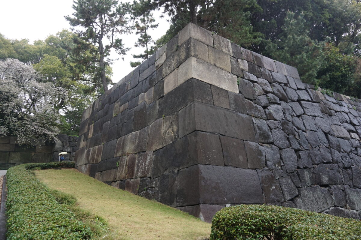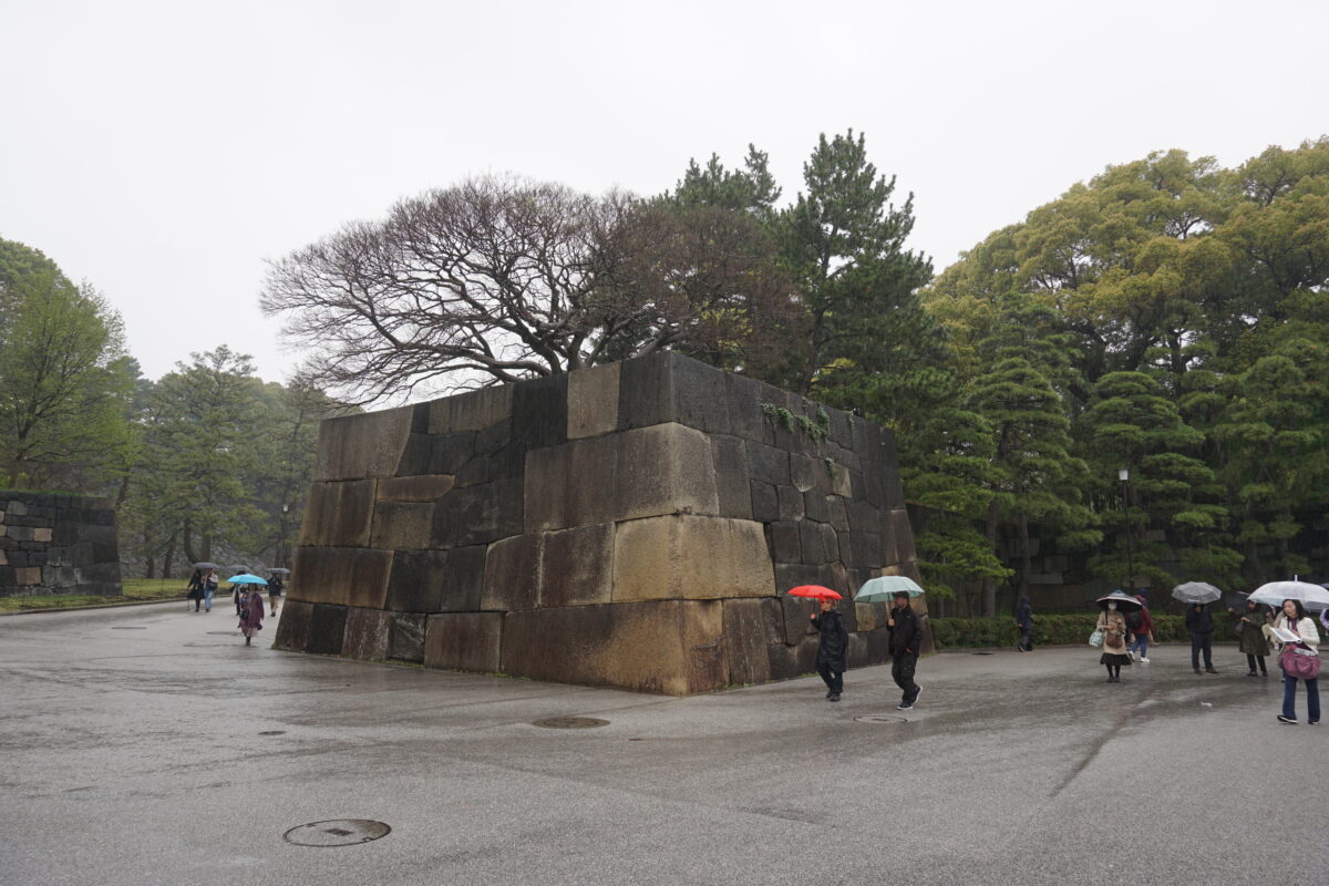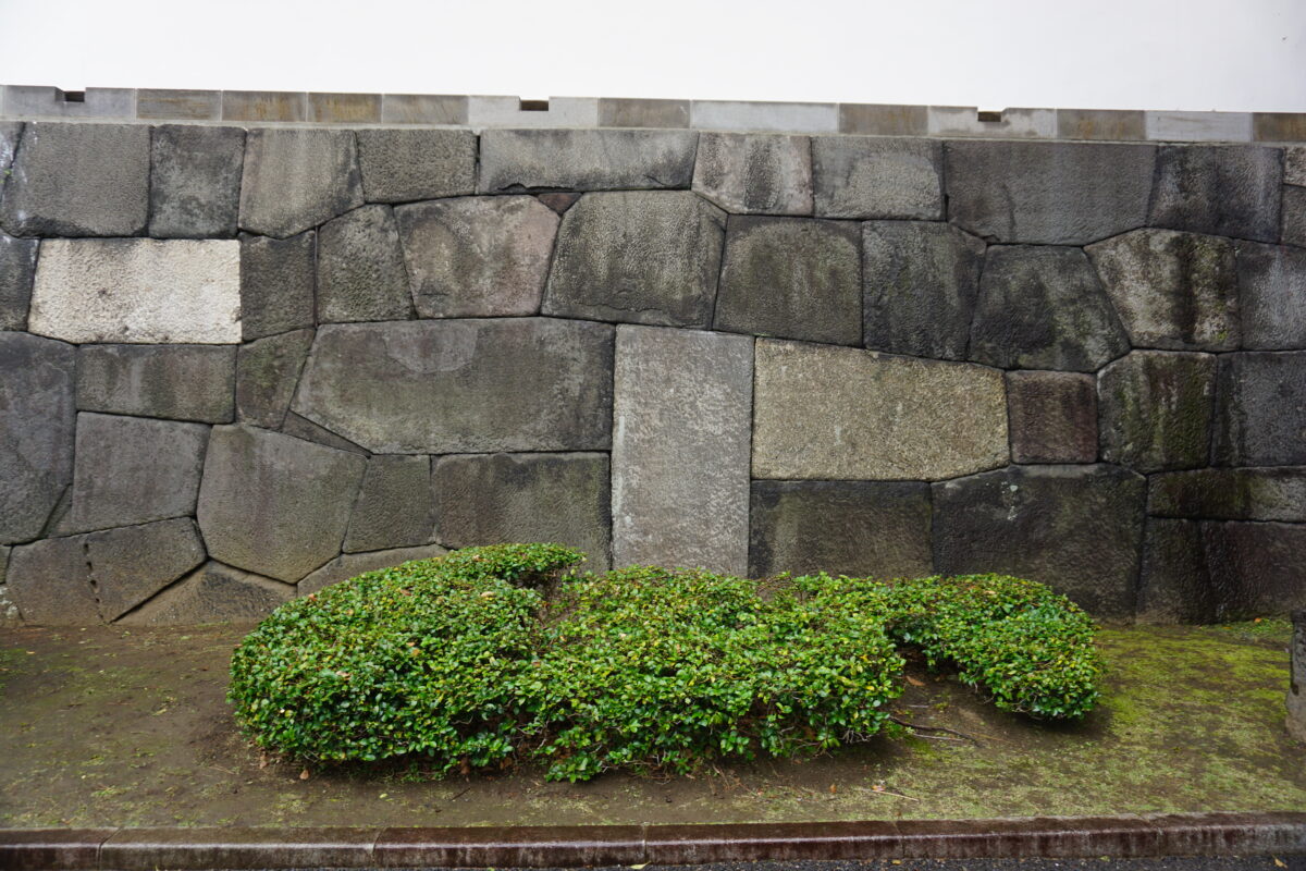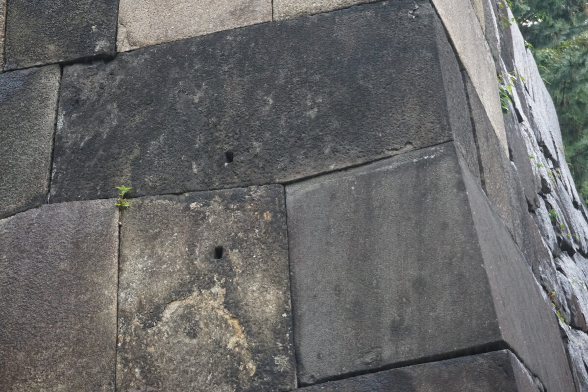 中の門の片側。黒の安山岩が多い江戸城ですが、白っぽい石は花崗岩。4代将軍徳川家綱は、西日本の花崗岩を運ばせ改築しました。
