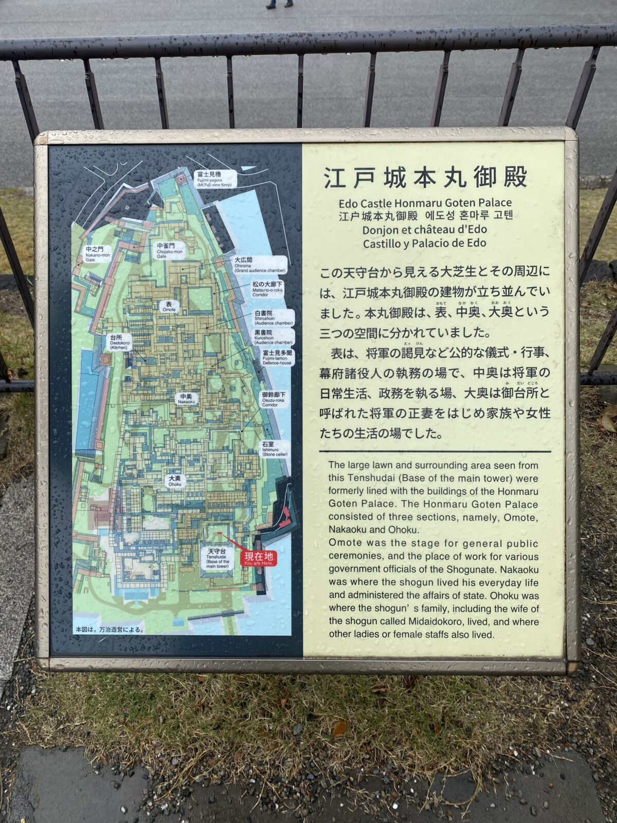 本丸は13平米。芝生は本丸御殿が建っていた場所です。南は儀式を行う場所と役人が控える場所。北へ行くと、中奥、大奥です。