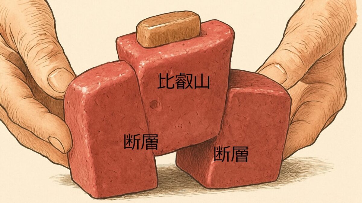 比叡山の琵琶湖側は逆断層、京都盆地側は右横ずれ断層となります。両側の断層の働きによる隆起により、比叡山が生まれました。ホルンフェルスは風雨により侵食を受けづらく、山頂に平地を維持しているのです。