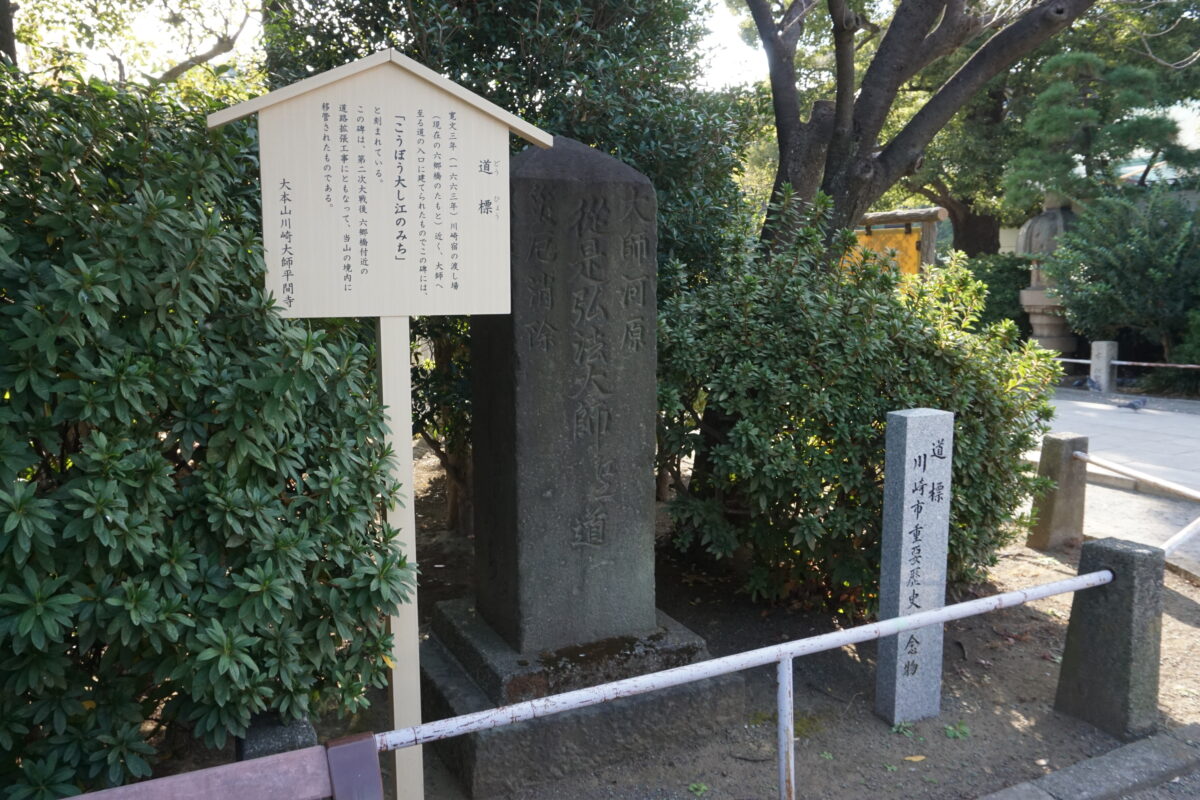 道標は、1663年(寛文3年)、現在の六郷橋たもとにあたる川崎宿の渡し場近く、大師へ向かう道の入口に建てられたものと伝えられています。往時の参詣者は六郷川を渡り、この道標に従って川崎大師を目指しました。