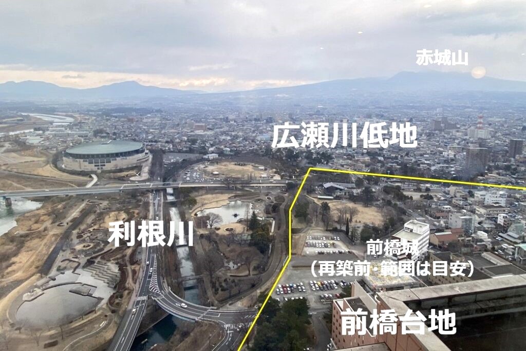 上空(県庁展望所)から見ると前橋城本丸は、利根川と広瀬川が削った台地の先端にあることが分かります。防衛などの利点から、台地の先端は城の立地としては定番となります。