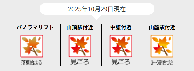 | 10月30日(日) | 1時間未満 | 見頃 | ただし11時ごろ到着では2時間待ち(うちゴンドラ乗車時に90分) ※同日13時頃下りは30分待ち |