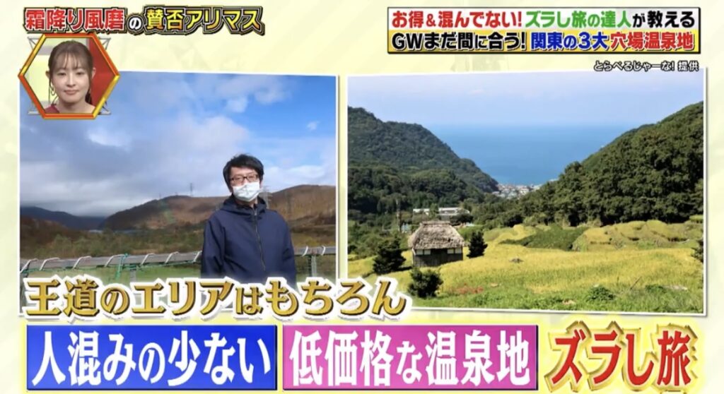 | 2023 | 4 | 日本テレビ 霜降り風磨の賛否アリマスに穴場旅の専門家として出演 |