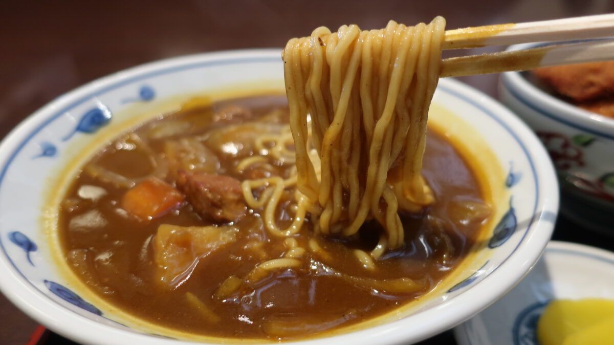 カレーラーメンは、上質な醤油を感じる和風だしが効いており、想像以上に深みがあります。麺はベーシックな中太麺。おそば屋さんのカレーのイメージに近いですが、完成度は高いです。